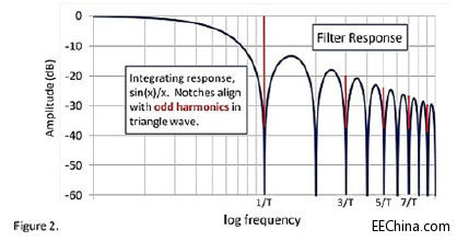 新一代斩波器安静多了,它集成了开关电容滤波器,这个滤波器在斩波频率及奇次谐波处具有多个陷波点。同时,在传输到下一级之前,完成电容C1的充放电。集成的充放电技术,使网络的输出均值十分接近零。在频域,它具有sinc(x) 或sin(x)/x 滤波器的频率响应特性,可以精确的通过基波并滤除三角波各次谐波。
