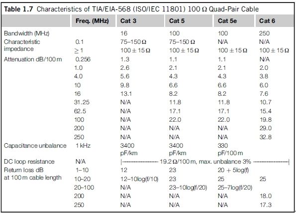 在真正设计LAN或电信端口接口之前,设备设计师可能对这种电缆的规范不是很感兴趣。但这种电缆的重要性越来越突出。表1.7给出了人们首选的100U四对电缆的TIA/EIA-568参数(ISO/IEC 11801和EN 50173具有相似的规范) 。该标准支持带宽越来越高的一系列分类。其中的5类和5e类电缆目前非常流行,得到了非常广泛的部署。