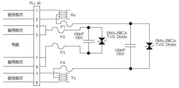 图3:以太网接口的电路保护—通过TVS二极管阵列来抵御建筑物内雷击。