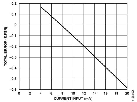 图5. 总接收器误差(%FSR)与输入电流(范围:4 mA至20 mA)在0.2 V至2.3 V输出范围下的关系