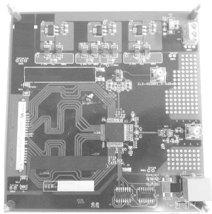 基于0.25微米混合信号CMOS工艺技术,并采用上述自校准电路设计方案,我们完成了一个采用分段式电流舵结构的16位400MSPS的D/A转换器芯片的版图设计,如图5所示,该电路芯片尺寸为4.9×4.9mm2,整个DAC电路一共有110个压焊块。目前该电路已经成功完成工艺流片,电路测试评估板的实物照片如图6所示。