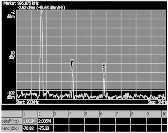 对封装后的DAC电路进行的初步测试结果表明,该DAC电路工作正常。图7为系统不带校准的实测SFDR,图8为系统带校准后的实测SFDR。可见经过自校准后,电路的SFDR提升了十几个dB,并且谐波也明显减小。