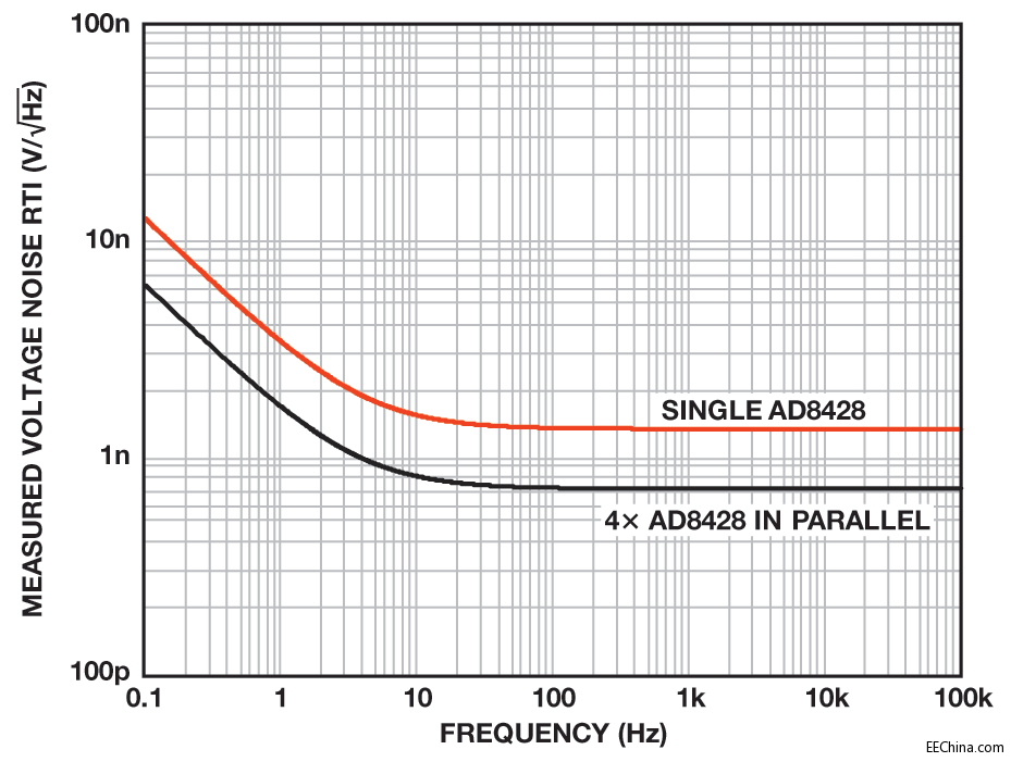 SPICE电路仿真虽然不能代替原型制作,但作为验证此类电路构想的第一步很有用。若要验证此电路,可以使用ADIsimPE仿真器和AD8428 SPICE宏模型仿真两个器件并联时的电路性能。图3中的仿真结果表明该电路的表现与预期一致:增益为2000,噪声降低30%。