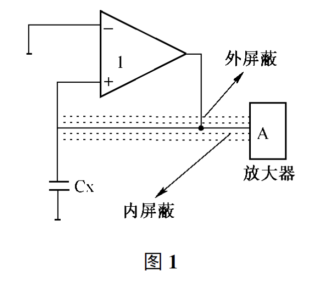 如图1所示:在压电传感器和放大器A之间采用双层屏蔽电缆,并接入增益为1的驱动放大器,这种接法可使得内屏蔽与芯线等电位,进而消除了芯线对内屏蔽的容性漏电,克服了寄生电容的影响,而内外层之间的电容Cx变成了驱动放大器的负载,电容传感器由于受几何尺寸的限制,其容量都是很小的,一般仅几个pF到几十pF。因C太小,故容抗XC=1/ωc很大,为高阻抗元件;所以,驱动放大器可以看成是一个输入阻抗很高,且具有容性负载,放大倍数为1的同相放大器。