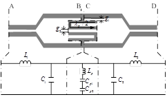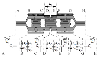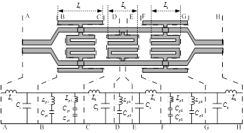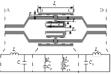 利用上述的开环结构(图2)和复合结构(图4)设计了一个三阶CPS低通滤波器,其结构和等效电路如图6所示。W和S的尺寸即为上述CPS尺寸,L1=5.6mm,L2=3.7mm,L3=3.5mm。