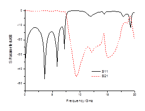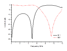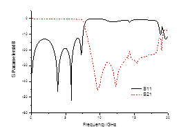 本文所设计的CPS结构低通滤波器所用介质板的相对介电常数为2.55,厚度为0.8mm,覆铜厚度为0.035mm。根据全波仿真软件IE3D分析,平行传输线的线宽W和间距S分别为0.6mm和0.4mm时,CPS的特性阻抗Z0为172ohm。