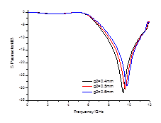 在图2中,开路环的长度为7.4mm,线宽为0.4mm,缝隙间距g1、g2均为0.4mm,谐振频率为9.4GHz,频率特性如图3(a)所示。通带内S21最小为-0.068dB,频率9.4GHz时S21达到-31.8dB。根据IE3D仿真曲线图3(b)分析,当缝隙S、g1、g2增大时,通带内的插损逐渐减小,谐振频率往高频偏移。主要是因为环与传输线、对称环之间的耦合电容减小,谐振频率变大,谐振Q值增大。