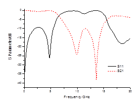 为了增强阻带的深度和宽度,在以上开环谐振器上加一对半波长T型谐振器,其结构与等效电路如图4所示。半波长T枝节等效为电感L’p,T枝节与传输线之间缝隙g3等效为耦合电容C’p。那么T型开路结构和开路环等效为两个串联的LC谐振电路,通过产生两个传输零点达到增加二次谐波衰减的目的。其中T枝节的长度为6.6mm,开口环的长度为7mm。频率特性如图5所示,在9.8GHz和13.6GHz处产生两个谐振点,S21分别为-24.5dB和-37dB,展宽了阻带。