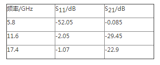 通过IE3D软件仿真得到,具有T枝节的三阶CPS低通滤波器的S11、S21频响曲线如图7所示。在5.8GHz、11.6GHz和17.4GHz处,S21分别为-0.095dB、-25.1dB和-13dB,很好的阻止了二次谐波。