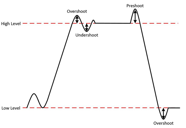 此外,在真实情况下,信号几乎不会达到电压电平并稳定地保持在该电平上。 当信号在边沿之后超过电压电平时,峰值失真被称为过冲。 如果信号在边沿之前超过了电压电平时,峰值失真被称为前冲。 在边沿之间,如果信号漂移低于电压电平时,则称为下冲。
