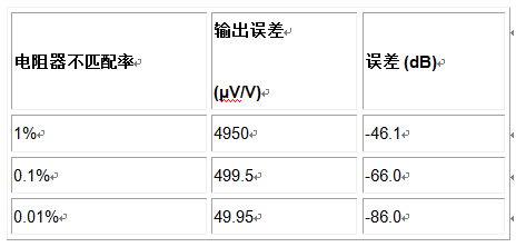 消除干扰信号的精确度取决于两个变量:电阻器匹配的精确度和运算放大器的参数(被称为共模抑制比 (CMRR))。假设的确存在完美的运算放大器,那么电阻器不匹配导致的输出计算则为一道简单的电子表格计算题。