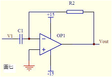 图七中由虚断知,通过电容C1和电阻R2的电流是相等的,由虚短知,运放同向端与反向端电压是相等 的。则: Vout = -i * R2 = -(R2*C1)dV1/dt 这是一个微分电路。如果V1是一个突然加入的直流电压,则输出Vout对应一个方向与V1相反的脉冲。