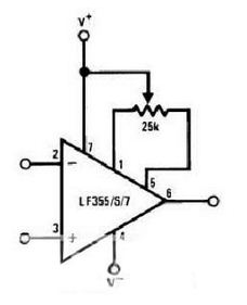今天运放已经发展的很迅速,附注功能各式各样,例如有些运放已经具有了调零的外接端口,此时依据数据手册进合适的电阻选择就可以完成运放调零。例如LF356运放,其典型电路如下:
