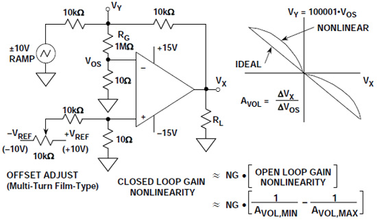 图2右侧的坐标图所示为VY与VX的关系图。如果不存在增益非线性,则图中所示应为斜率不变的直线,AVOL按以下公式计算: