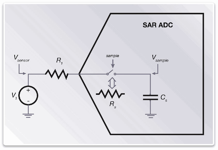 当电路闭合时,传感器就充当一个加载采样电容的源,时间常数τ=RC。如果传感器输出阻抗很大,那么时间常数也大,可能就没有足够的时间来建立采样电容的电压到一定精度。