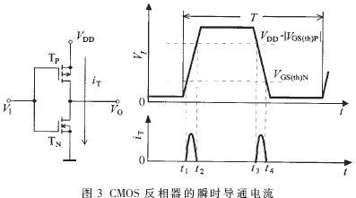 据CMOS反相器的工作原理可知,在稳定状态下,电源提供的电流极小,一般可以忽略不计;而在动态情况下,如果取VDD>VGS(th)N+VGS(th)P,VIH≈VDD,VIL≈0,那么当VI从VIL转换到VIH和从VIH转换到VIL的过程中,都将经过短暂的VGS(th)N〈VI〈VDD-VGS(th)P的状态。在此状态下,TP和TN同时导通,从而在电源与地之间形成瞬时的低阻通路,瞬时电流iT流经TP和TN,形成电源电流尖峰脉冲,如图3所示。