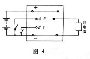 图4是应用与门的基本电路,只有两个输入端A、B同低电位间的开关同时断开,A与B才同时是高电位,输出端也因而是高电位,用电器开始工作。