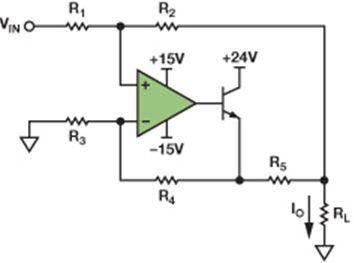 图1所示的改进型Howland电流源非常受欢迎,因为它可以驱动接地负载。允许相对较高电流的晶体管可以用MOSFET取代,以便达到更高的电流。对于低成本、低电流应用,可以去除晶体管,如《模拟对话》2009年第43卷第3期“精密电流源的心脏:差动放大器”所述。