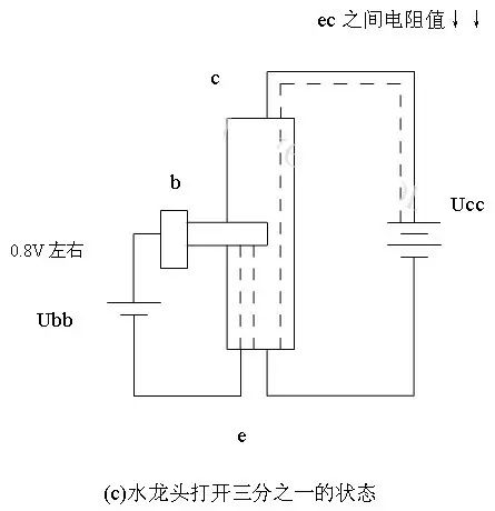 ② 如图 2.20 ( b )所示:当对发射结施加电压在门限电压范围时(以硅管 0.7V 左右为例),相当于闸门松动一点点,从水龙头底部通过水嘴流出的水成滴答状态。此时, ec 之间的电阻值也下降了一点点。