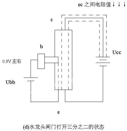 ④ 如图 2.20 ( d )所示:当对发射结施加电压在 0.9V 时,相当于闸门已打开三分之二的状态时,水龙头底部已经可以有三分之二的水通过水嘴流出来了,此时, ec 之间的电阻值也下降了三分之二, ec 之间的电流处于调控或者说是放大状态。