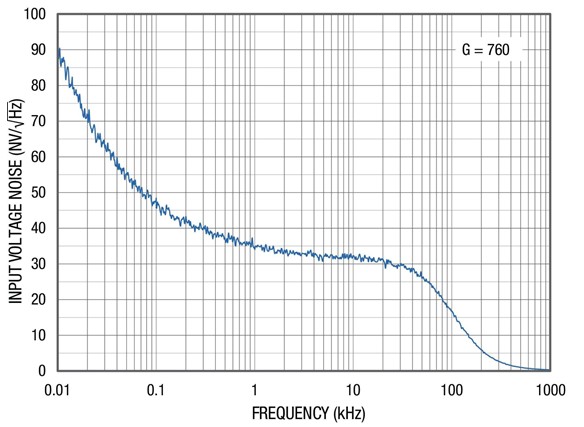 Exar 的 AFE 提供 14 位信号路径线性度,并提供低峰间值噪声 (2μVpp at G = 760) 和低输入电压噪声(G = 760 时为 35nV/√Hz),请参阅图 2 和 3。XR10910 的低噪声性能结合低偏置电流能力(最大为 100pA)使得该 AFE 能够与各种传感器连接并与 3V 至 5V 16 位 ADC 完美配对。