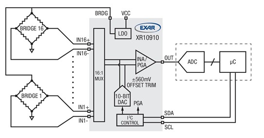 XR10910 提供了与多达 16 个桥式传感器连接的易于使用的解决方案。XR10910 仅消耗 457μA 的电源电流和仅 36mm2 的面积,为 16 个桥式传感器提供了业界最小、功耗最低的接口。