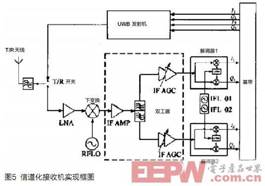 在UWB系统的设计中,对于UWB的发射信号分析也是其中的重要一环。由于超宽带系统的信号带宽很大,如果直接进行数字采样,需要极高的采样率,同时给后续的数据传输和数据处理带来较大的困难。因此常用的方式是通过信道化接收机进行相应的信号处理,也就是说把超宽带信号分成几个频带,每个频带对应一个相应的信道化接收机。然后通过不同的本振将不同频带混频至一个较低的频率进行相应的采样和信号处理,如图5所示为信道化接收机的实现框图。