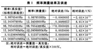 笔者在实验室使用RIGOL-DG1015DDS信号发生器校准。通过修正单片机时钟偏差,22.118 4 MHz的12分频为1.843 2 MHz,对1 843 200 Hz修正86.95 Hz后带入程序计算,整数频点测量结果可以达到和信号发生器完全一致,接近零误差。特针对一些非整数频点进行测量,结果如表1所列,误差达到10-7数量级,与理论值一致。
