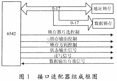 接口适配器用于连接被测设备和测试平台。设计时只选用一块6542模块,所以只有32个输出通道,不能实现所有信号的有效同步输出,设计时需采用数据线和地址线共用的原则予以解决。接口适配器的组成框图如图1所示。选择6542的portO~port2作为公用的地址线和数据线,port3作为控制线。锁存器选择双向锁存器,通过锁存方向控制数据的输入/输出,片选控制线控制数据的锁存,锁存输出控制线控制锁存器里的数据读出。