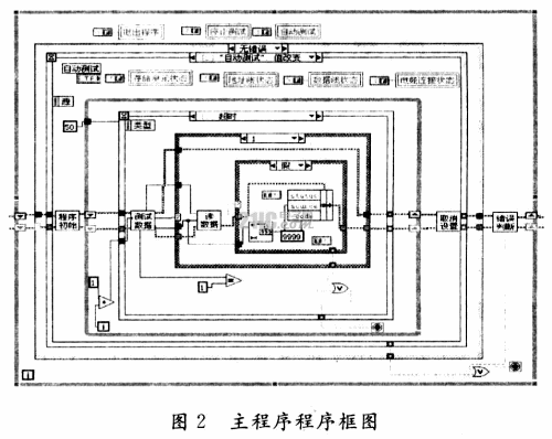 主程序依托LabVIEW软件,采用模块化的设计思想,主要包括程序初始、测试数据、读/写数据、取消设置、和错误判断五个部分。程序初始模块,用于进行面板参数设置和板卡设置;测试数据模块。用于:通过对数据库数据的查询,提取地址和数据等信息;通过对读/写信息的判断,选择数据信息输出的读入。如果测试时出现异常现象,则由程序输出自定义错误,通过自定义错误传递故障信息,同时跳出读/写循环;取消设置,用来恢复测试时改变的各个参数;错误判断模块,用于判断错误类型,通过判断自定义错误携带的信息判断故障类型,并反馈给人机界面。图2是主程序的程序框图。