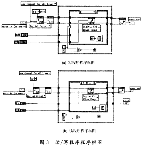 对存储器测试时采用March算法。March算法的特点是向存储器顺序地写入和读出数据,通过分析数据判断存储器的故障。因此在测试程序的编制过程中,数字信号的输入/输出较为关键。图3是读/写操作的程序框图。根据适配器的实际方案.数据的输入/输出在设计时也有一定的要求。向存储器写数据时分为三个步骤:向锁存器写地址,向锁存器写数据,锁存器和状态输出。读取存储器的数据分为4个步骤:向锁存器写地址,锁存器和状态输出,检测数据输出有效信号,读锁存器数据。实际应用时,可以根据不同的芯片,设置不同的延迟时间,以满足读/写周期的要求。
