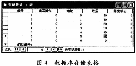 软件设计时,采用主控程序与测试信息分离的思想,通过数据库来存储测试信息。数据库采用比较常用的数据库Access。测试时,根据不同的测试算法,将不同测试数据编绘到数据库中。测试时主程序通过SQL语言对数据库进行调用,控制数字信号的输入/输出,从而实现测试内容的可扩展性。根据 Marct,算法的规则,设计数据表时,要设计编号、读/写操作、地址、数据和结束标志5列。编号用来实现Marcrt算法的顺序执行;读/写操作用于主程序中判断数据的读/写操作;地址用于存储地址信息;数据用于存储数据信息;结束标志用于结束本算法的测试。数据库存储表格如图4所示。第一行表示第一次读/写操作,向0地址写入数据80。