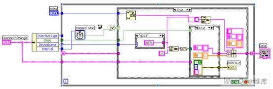 数据采集程序将每个设备的驱动程序做成插件(Plug-in)的形式,以后如有新的测试设备加入,只需要按照固定的输入输出模板进行编写后,放入到指定的插件目录(Support\Plug-in),即可实现新的测试功能。插件形式采用了VI Server技术,通过调用插件目录中的设备驱动VI,按照固定模式写入设备采集参数,即可输出得到采集的数据。