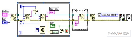 通过利用TCP/IP通讯,轻松实现网络采集分析。过去传统数据采集一般利用GPIB,RS232/485等传统现场总线的方式,很难实现远距离的数据采集功能。通过利用LabVIEW中VISA对TCP/IP的支持,结合现代工厂网络的稳定性增强,可充分实现远距离的数据采集功能。并将此功能拓展,实现整个工厂的试验台的集中监控管理。NI Example中自带TCP/IP通讯,如下所示: