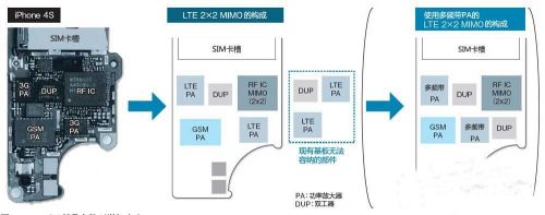 新一代iPhone要支持LTE的话,两根天线的安装问题已随着iPhone 4S实现接收分集而解决,但包括功率放大器IC在内,RF收发器IC的封装面积将达到现在的约两倍(图6)。另外,由于有两倍数量的功率放大器IC同时驱动,因此耗电量也将上升到两倍。
