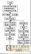 系统上电后,首先对单片机进行初始化,然后对A /D进行初始化,之后系统开始工作。首先采样甲烷浓度并显示,超过安全值报警; 然后采样环境温度并显示; 最后显示时间,循环采样并实时显示。