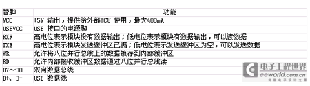 USB100内部封装了USB1.1的全部协议,并带有384字节的发送缓冲区和128字节的接收缓冲区,8位并行数据接口。对USB的操作编程类似对外部存储器的操作,由于该模块完成了全部USB协议的转换和封装,使得对USB的开发和应用过程变得非常简单,用户只要在PC机上安装USB100模块驱动程序以后,对其编程可以按照与串口完全一样的方法来完成。USB100主要的管脚及功能如表1 所示(未列出的管脚为空脚)。