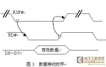 如图3所示,当检测到USB100模块RXF为低时,表示内部接收缓冲区有来自USB端口的数据可通过8位数据线将数据读入,接收数据锁存器由RD控制(边沿触发)。