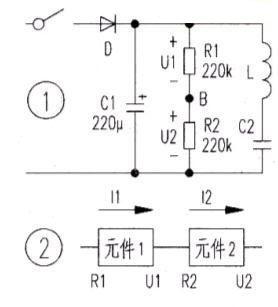 有些元件是可在路直接测得其精确阻值的。如图1中的R1、R2,因有电容、开关等直流电阻为无穷大的元件将它们与电路的其他部分隔开,断电后在路测量和取下来测量一样。厂有些元件虽不能直接测量,但可间接测到其准确阻值。如图2,元件1和元件2串联,如已知元件1的电阻值R1,只需通电测元件1和元件2的端电压U1、U2。根据串联电路的特性11=12以及欧姆定律可知:元件的端电压与其电阻值成正比例,故只需精确测得Ul、U2的值,即可求得元件2的电阻值(注:元件1和元件2均应为线性元件)。