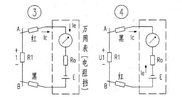 将上述测量中的红、黑表笔对掉,即用万用表黑表笔接A点,红表笔接B点时(见图4),U1与E反串,U1提供给表头的电流Ic的方向和表内电池E提供的电流Ie的方向相反,使得通过表头的电流减小,测得R1的阻值偏大,当U1的大小接近E时,指针几乎不偏转,R1会被怀疑断路。如U 1.>E,将会使表头中通过的电流远大于其满偏电流,轻则将万用表的指针打坏,重则烧坏表头,有时还会通过万用表将高电压加到某元件上而将之损坏。由此可见,检测时对高压电容放电的重要性。
