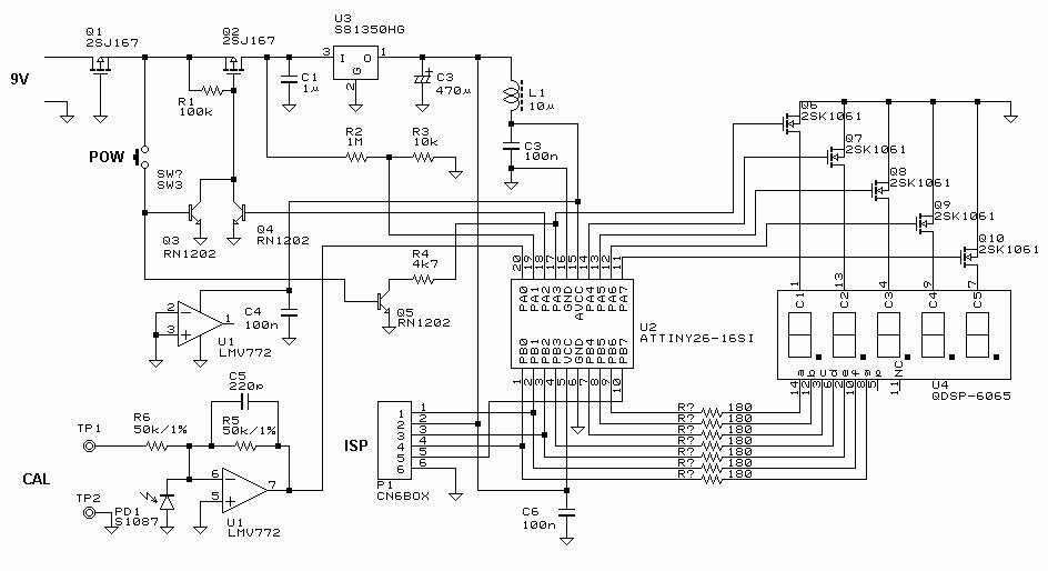 其中,以U1 LMV772为核心器件的I-V转换电路将光电管S1087的电流信号转换成电压信号,送入U2 AtTiny26的内置ADC。R5决定了转换系数,为50mV/μA;C5用来增益修正,滤除高频信号。