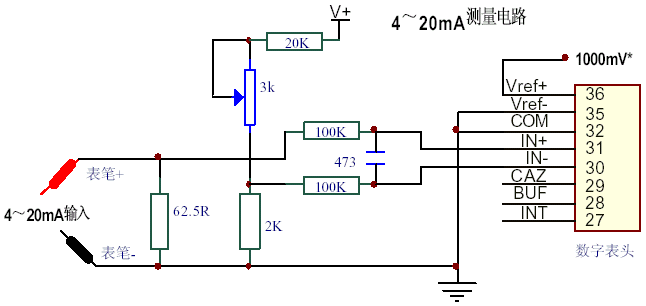 电桥输入电路的变种还可以延伸到下面的电路,这是一个把 4~20mA 电流转换为数字显示的电路。它的零点就是 4mA 而不是 0mA 。当输入零点电流为 4 mA 的时候,利用 IN- 上面建立起来的电压,抵消掉 IN+ 由于 4mA 出现的无用信号,使得数字电压表差分输入=0,就实现了 4mA 输入时显示为 0 的要求。随着信号的继续增大,例如到了 20mA ,对数字电压表来说,相当于差分输入电流为 20-4=16mA ,这个 16mA 在 62.5R 电阻上的压降,就是数字电压表的最大输入信号。这时候,把数字电压表的基准电压调整到与 16*62.5=1000mV 相等,显示就是 1000 个字!
