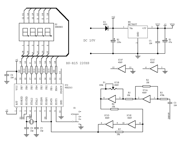 电路仅用了两块集成电路,CD4069用于小信号的放大和整形,AT90S2313则是一块精简指令的高速单片机,它在8M时钟下的性能超过了51系列在100M时钟下的性能,在电路中担任测量、运算和显示驱动。大多数的数显频率计采用一个“秒闸门”计数,因而在低频时测量误差加大,也无法显示小数,而本电路采用了脉冲宽度和密度双重测量技术,辅以高速浮点运算,因而测量精度高,并能自动转换量程,显示小数。例如测量的结果可能是 0.543,261.4等等,利用它测量交流电频率,你可以看到结果一般在 49.82-50.17 之间缓慢变化,因此本电路非常适合装在发电机、配电房里作交流电的频率显示。