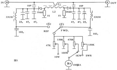 图1电路使用黑白电视机天线匹配器的双孔磁环,将其改成单孔磁环使用效果较好。先在磁环上用Φ0.15的漆包线平绕50T,用递减圈数的办法找REF挡的的零点。输入20瓦的7~14兆赫芝的CW信号,输出端接一40瓦50欧姆的假负载。每注入一次信号,都要在FWD档(正向档)调RW使表头满度。然后,迅速打到REF档(反向档)看表针回落的位置。如指针偏高时,可拆去L2,5T左右重新打正向档再输入CW信号,并利用RW调好满度,再打到反向档看表针的位置。这时,会发现回落值比第一次多了,即表针向左边移动的数值大了,与零点的位置距离小啦。这是路子对头,接着可以重复上次的调整方法调下去。当表针指到5uA左右,放慢速度,一圈一圈的拆。在调整中,要不时地变动磁环在L1上的位置,变换它的静止姿态,这都是影响到零点位置的因素,还不要忘记同时调正其中一只瓷质微调,(作用小)而另一只瓷质微调不起作用。反复多次后,表针在反向档位就可进入零值。