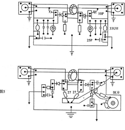 电路中的1K欧姆的电位器,在反向档调零时对调零值作用很大。高频变压器的位置不要事先固定!L1与L2之间(磁环孔中)要用高耐压的绝缘绸垫好,借以提高耐压程度,并用蜂腊在调好后把磁环固定住。还有一点教训是零点调好后,迅速固定且不能再动任何部位了,如果这时剪短线圈引线长度、重新绕线圈换粗线等都会使平衡条件破坏,最佳点是没有重复性的。图中的a点是做正向电压测试,也可做反向电压的测试。它取决于L2的绕向,想改变绕向只有取下磁环重绕,只改变线头、线尾的焊接位置对方向无效。相比之下,图3电路调整顺手。因是大功率电阻从天线上分压,可测大功率,击穿元件的可能性比较小