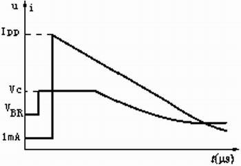 图2 TVS电压(电流)时间特性 ?最大箝位电压VC和最大峰值脉冲电流IPP。当持续时间为20mS的脉冲峰值电流IPP流过TVS时,在其两端出现的最大峰值电压为VC。VC、IPP反映了TVS的浪涌抑制能力。VC与VBR之比称为箝位因子,一般在1.2"1.4之间。