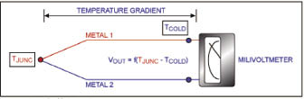 托马斯•塞贝克在1822年发现了热电偶原理。热电偶是一种简单的温度测量装置,由两种不同金属(金属1和金属2)组成(图1)。塞贝克发现不同的金属将产生不同的、与温度梯度有关的电势。如果这些金属焊接在一起构成温度传感器结(TJUNC,也称为温度结),另一端未连接的差分结(TCOLD,作为恒温参考端)上将呈现出电压,VOUT,该电压与焊接结的温度成正比。从而使热电偶输出随温度变化的电压/电荷,无需任何电压或电流激励。