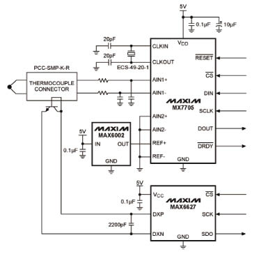 图2 热电偶测量电路。MX7705测量热电偶输出,MAX6627和外部晶体管测量冷端温度。MAX6002为MX7705提供2.5V精密电压基准。