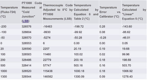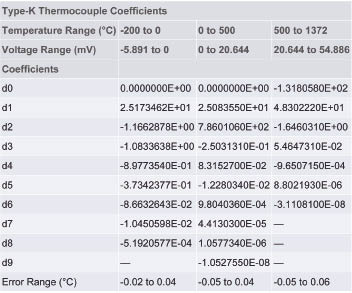 利用表2中的多项式系数,能够在-200℃至+1372℃温度范围内以优于±0.1℃的精度计算温度T。大多数常见热电偶都有不同系数表可用。