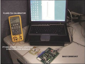 图7所示为图4的开发系统。该系统包括经认证的精密校准器,Fluke®-724,作为温度模拟器代替K型OMEGA热电偶。